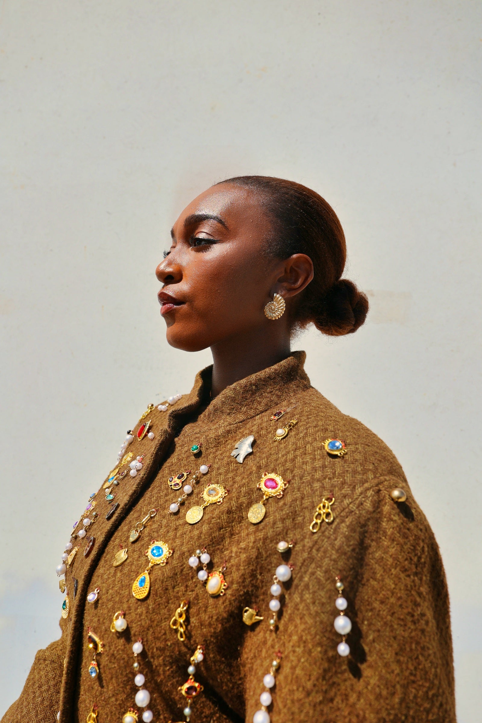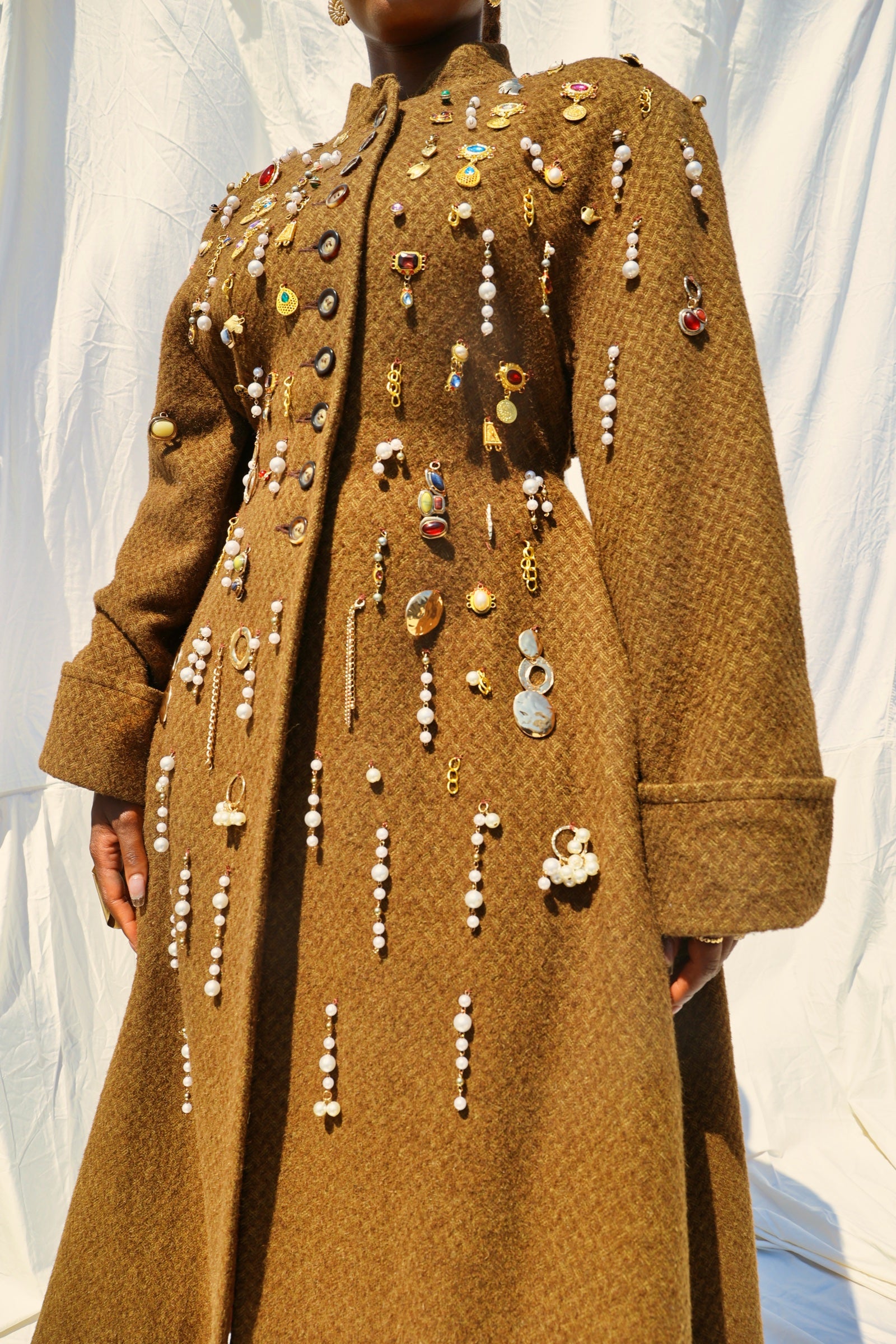 The CINDY trench is a one-of-one reworked vintage piece, sold exactly as styled. It features oversized sleeves, structured shoulders, and custom gold detailing. A collector’s piece.