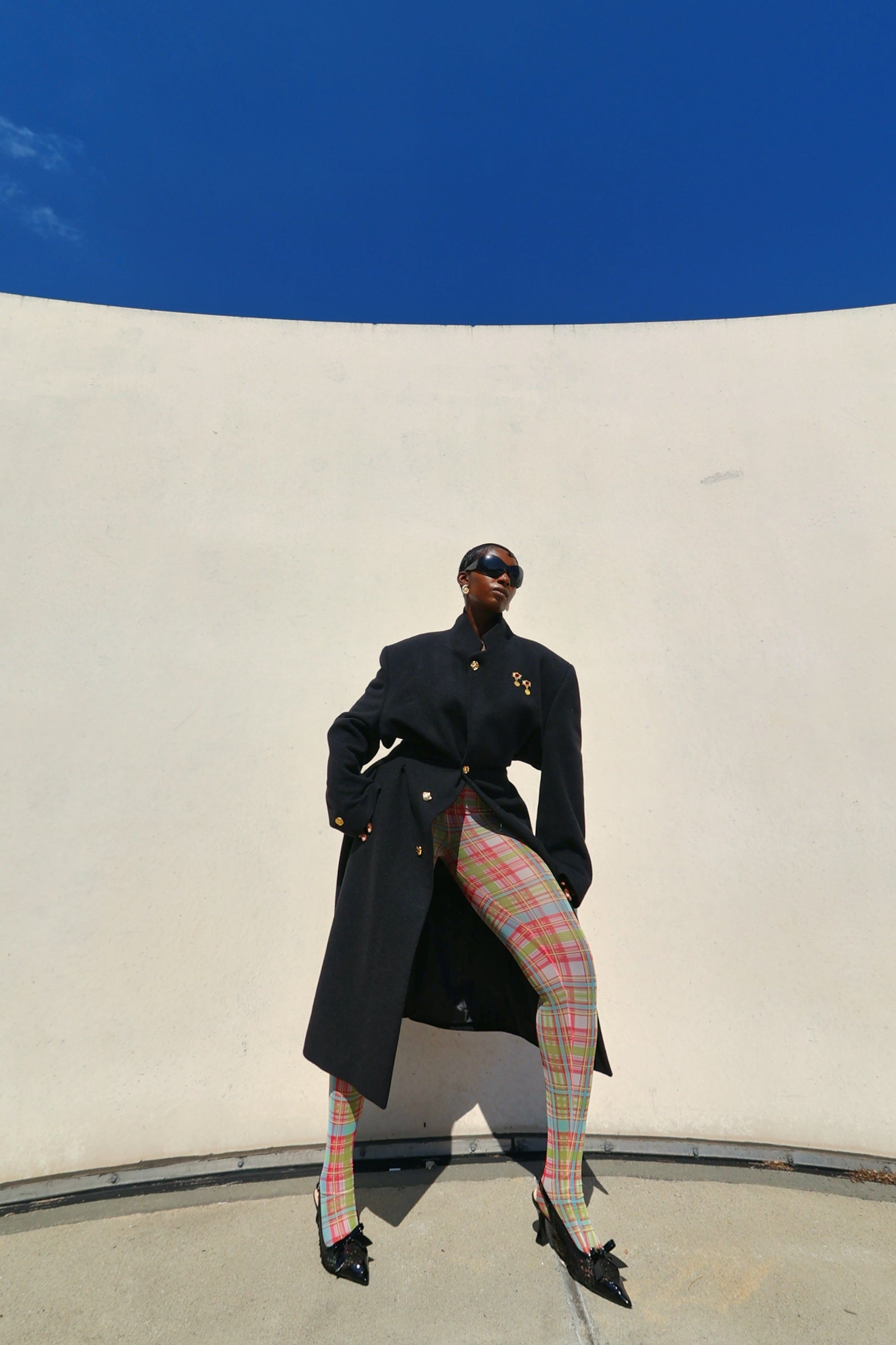 The Ella trench coat is a one-of-a-kind vintage statement piece reworked with gold-toned buttons and bold structure. Its sharp tailoring and dramatic silhouette speak to quiet power. Made from a deep black wool blend and sold exactly as styled—excluding tights and accessories.
