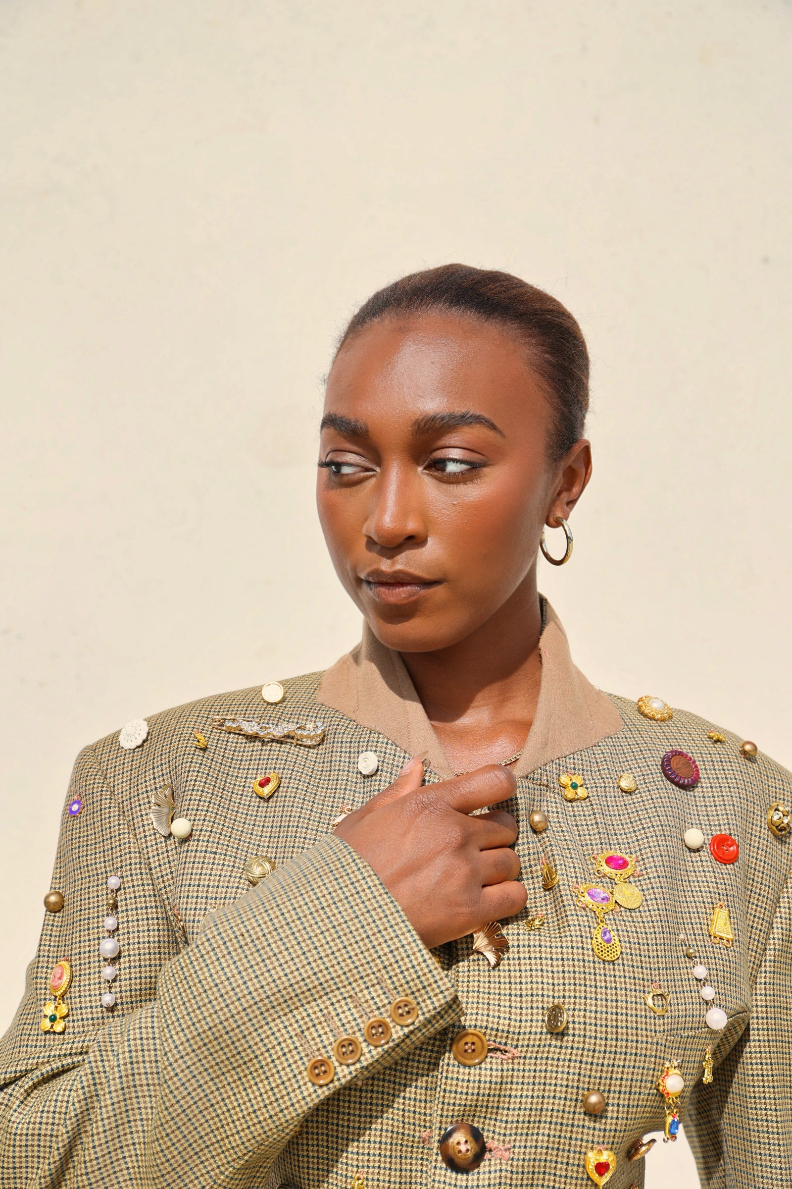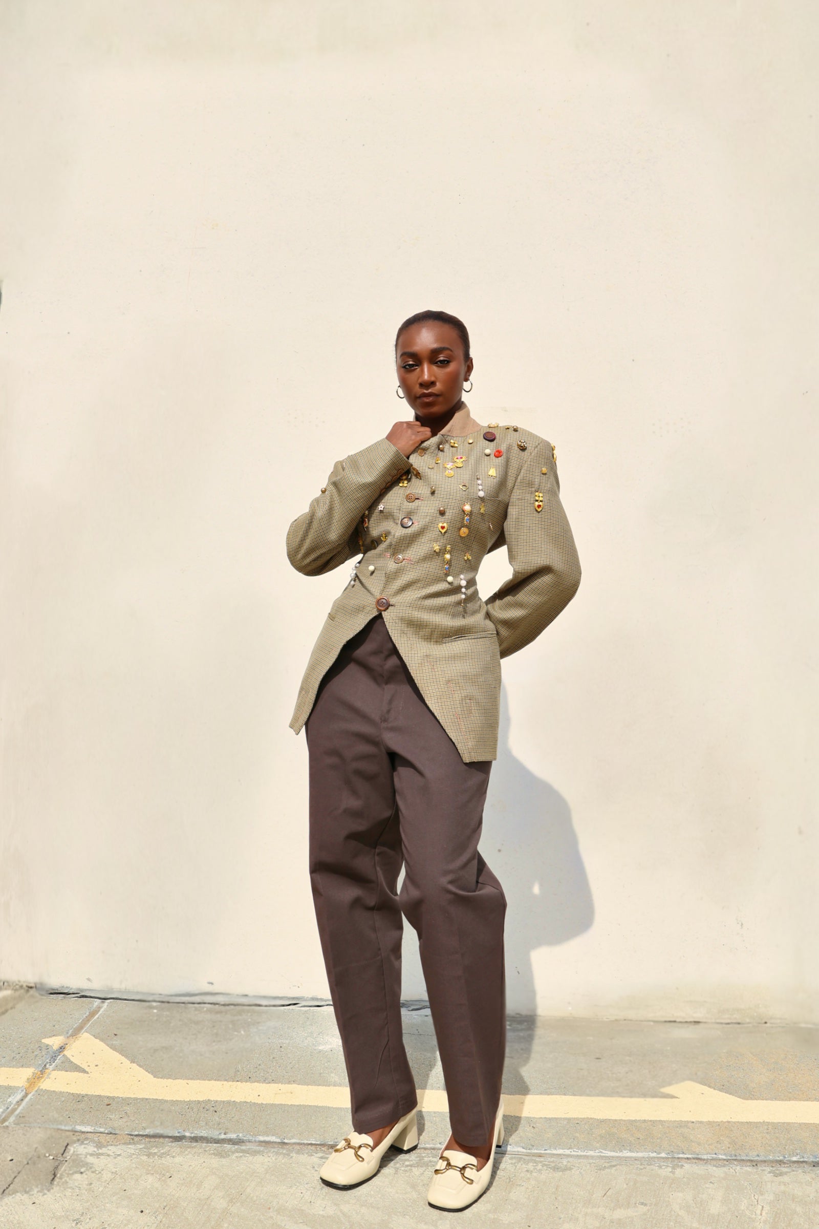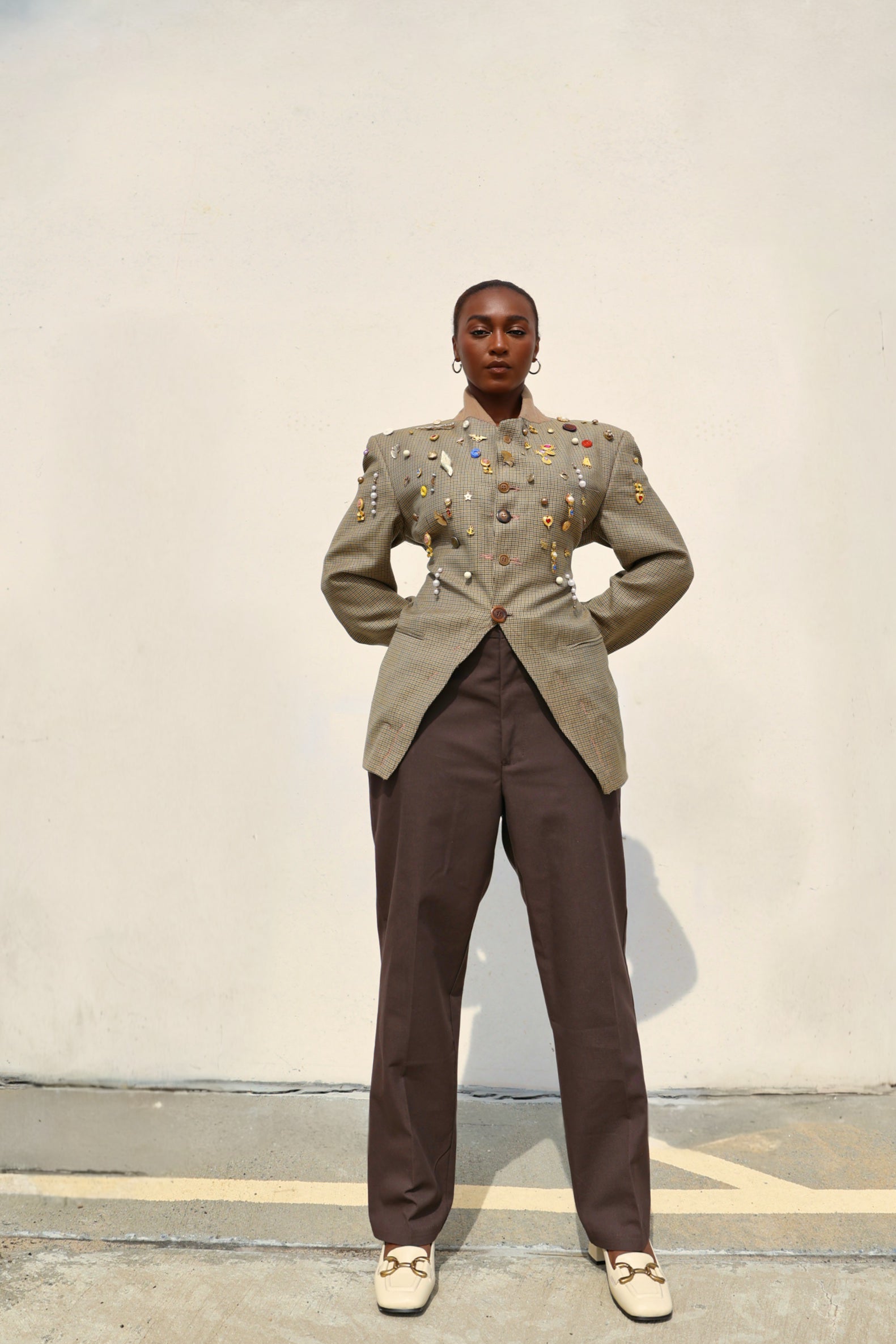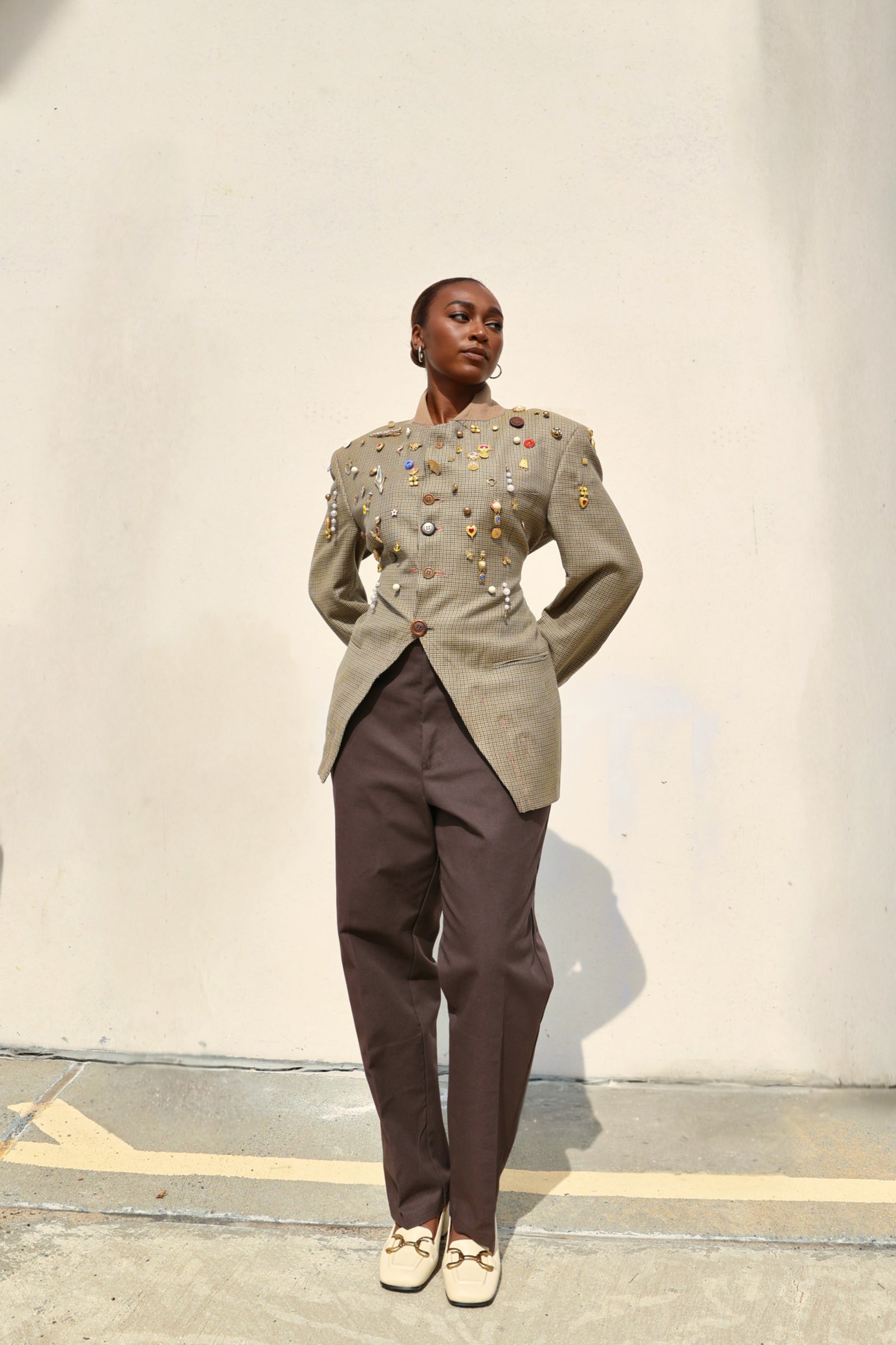 The KIRU set, is a one-of-one vintage ensemble reimagined for bold expression. The tailored blazer is fully embellished with a curated collection of gold-toned buttons, pearl details, and novelty charms—each hand-selected for balance and texture. Strong shoulders and a defined waist give the piece its sculptural edge.
