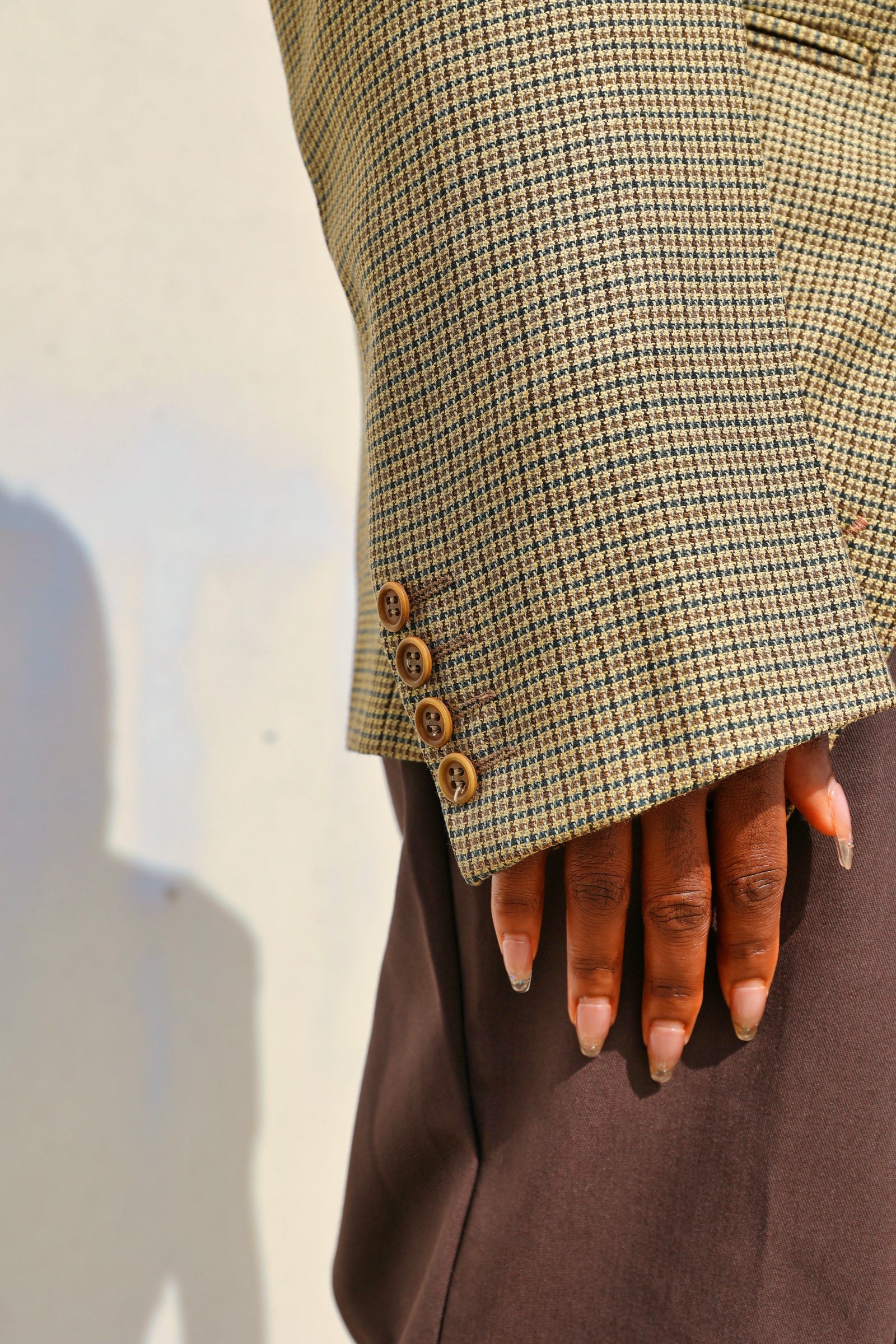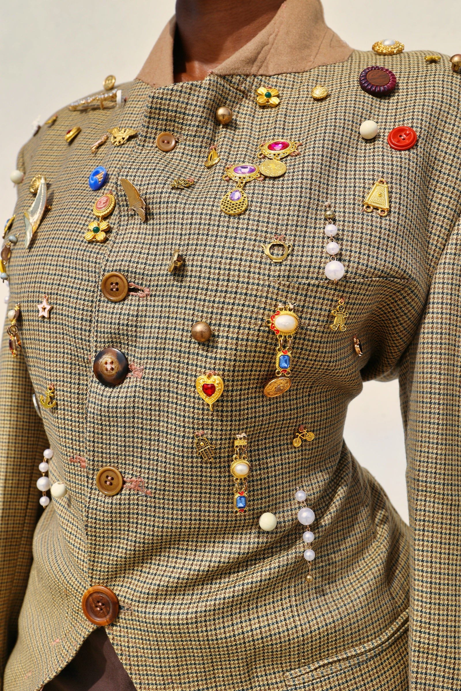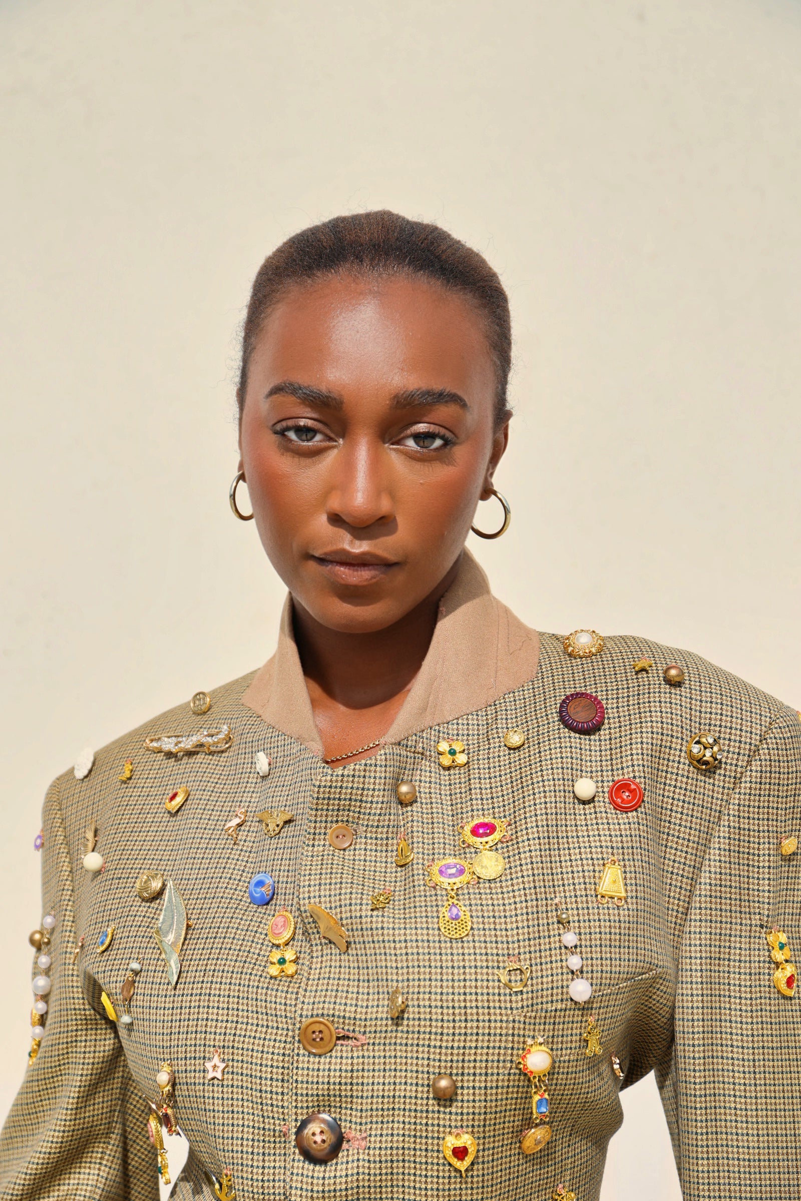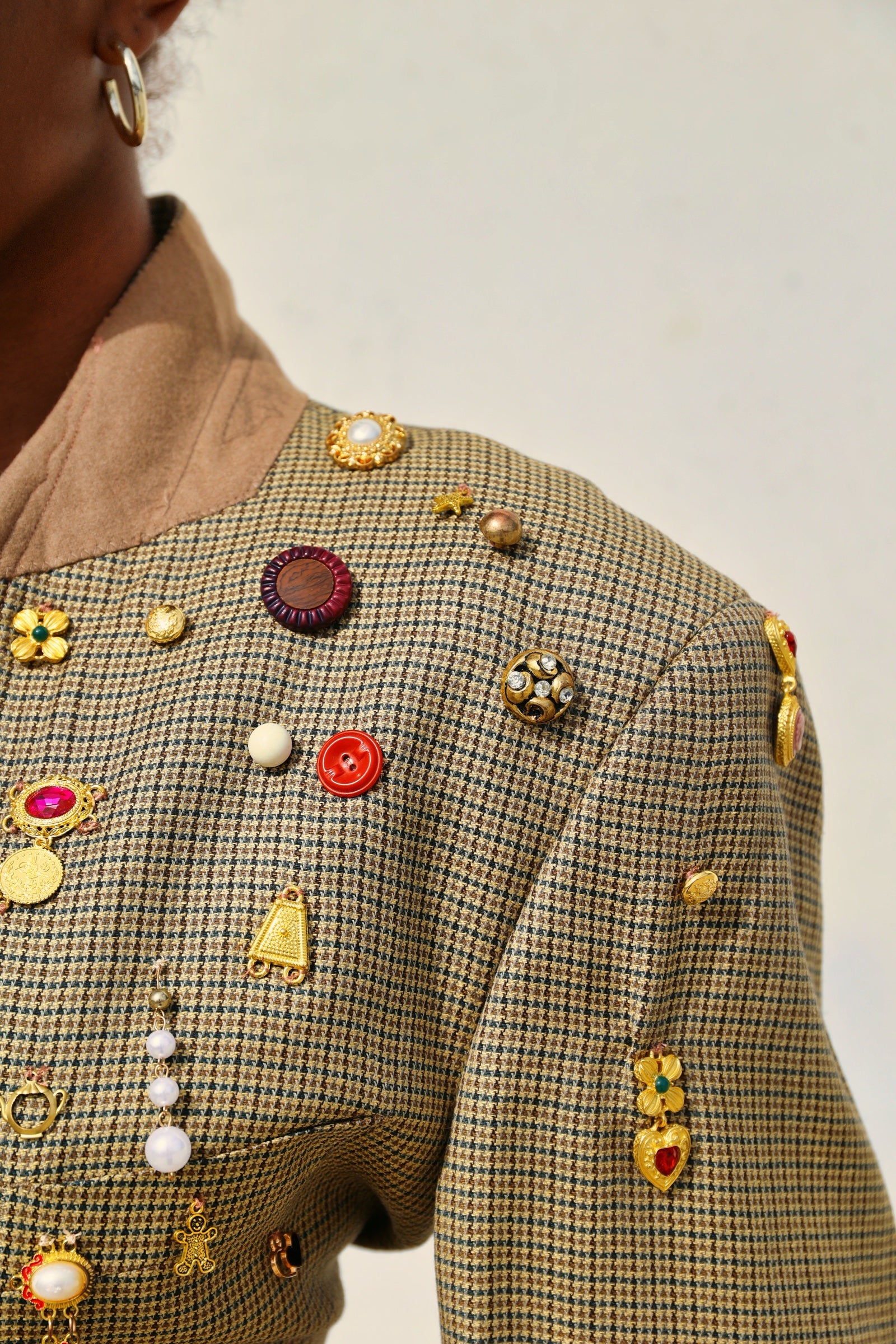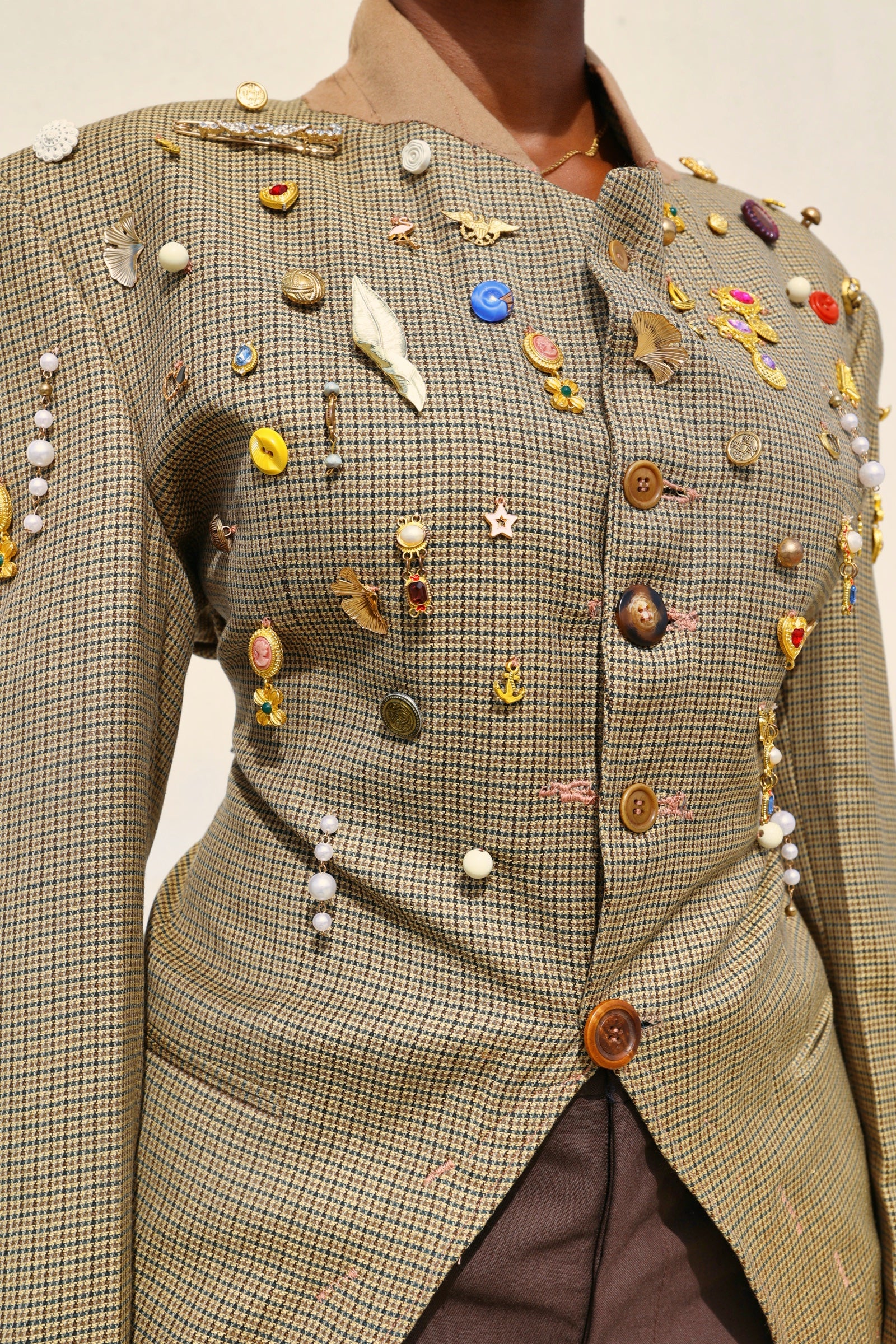 The KIRU set, is a one-of-one vintage ensemble reimagined for bold expression. The tailored blazer is fully embellished with a curated collection of gold-toned buttons, pearl details, and novelty charms—each hand-selected for balance and texture. Strong shoulders and a defined waist give the piece its sculptural edge.
