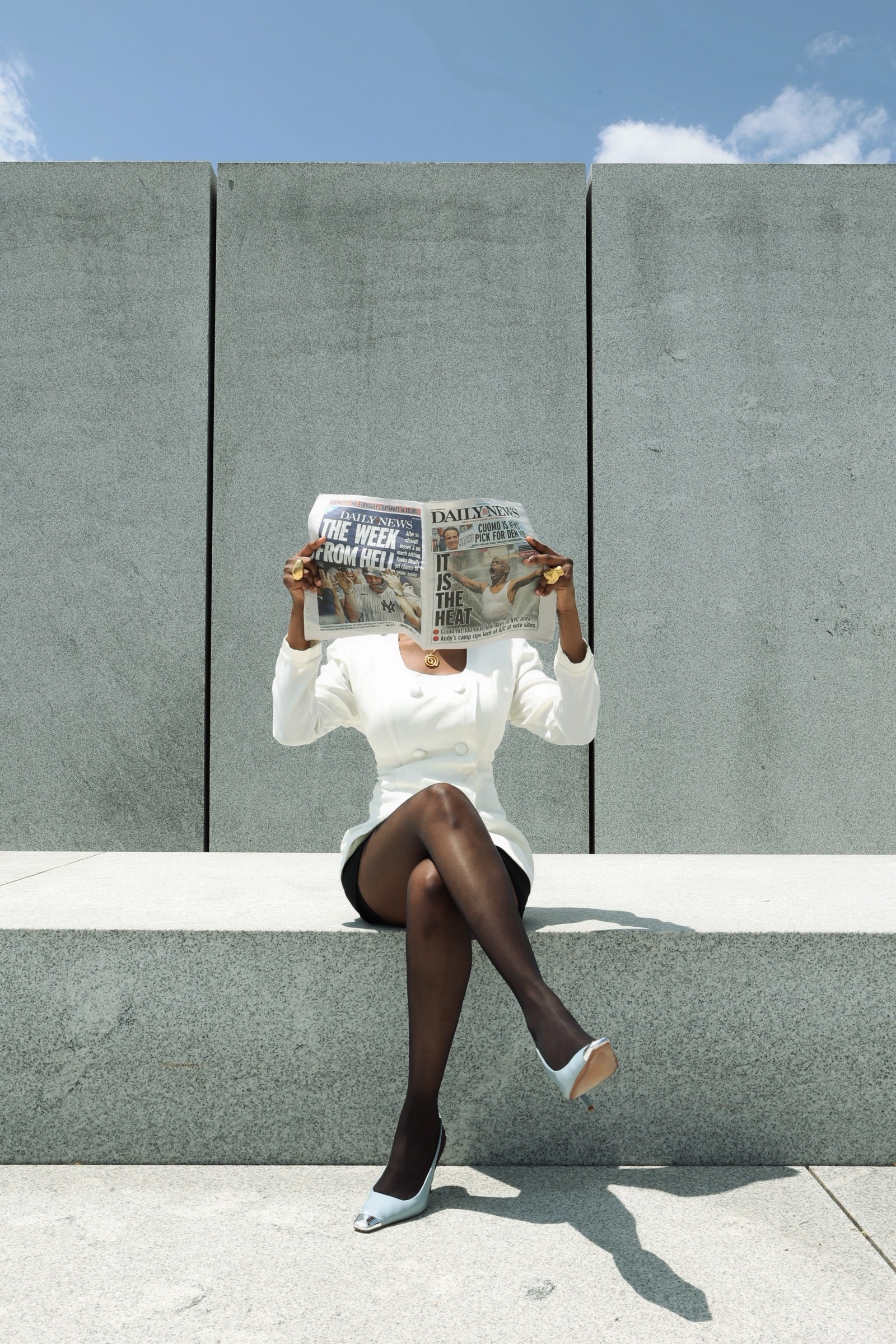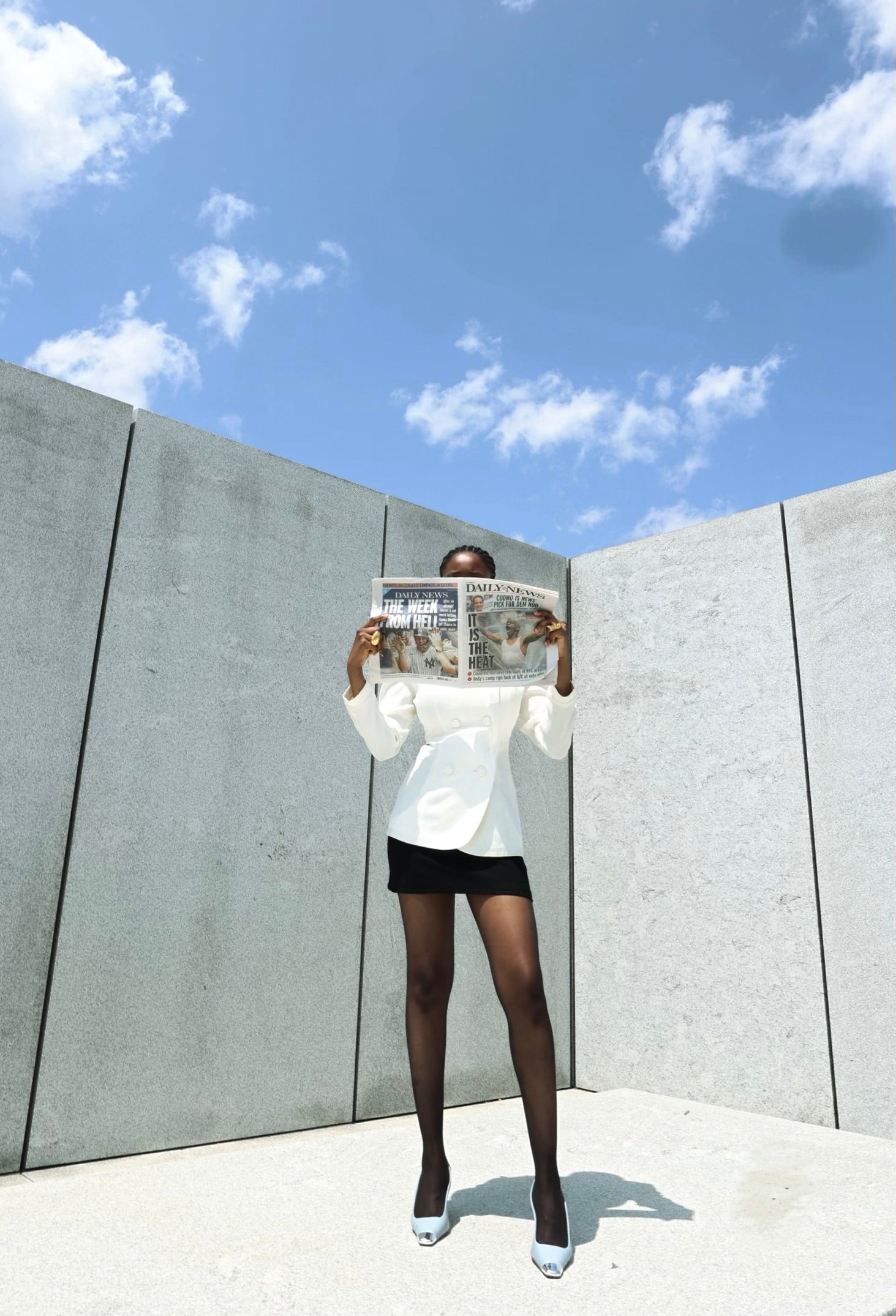 A one-of-a-kind reworked vintage set featuring a crisp white double-breasted blazer with structured shoulders and subtle curve tailoring, styled with a fitted black mini skirt. Clean, sharp, and timeless. Sold as styled , blazer and skirt included.