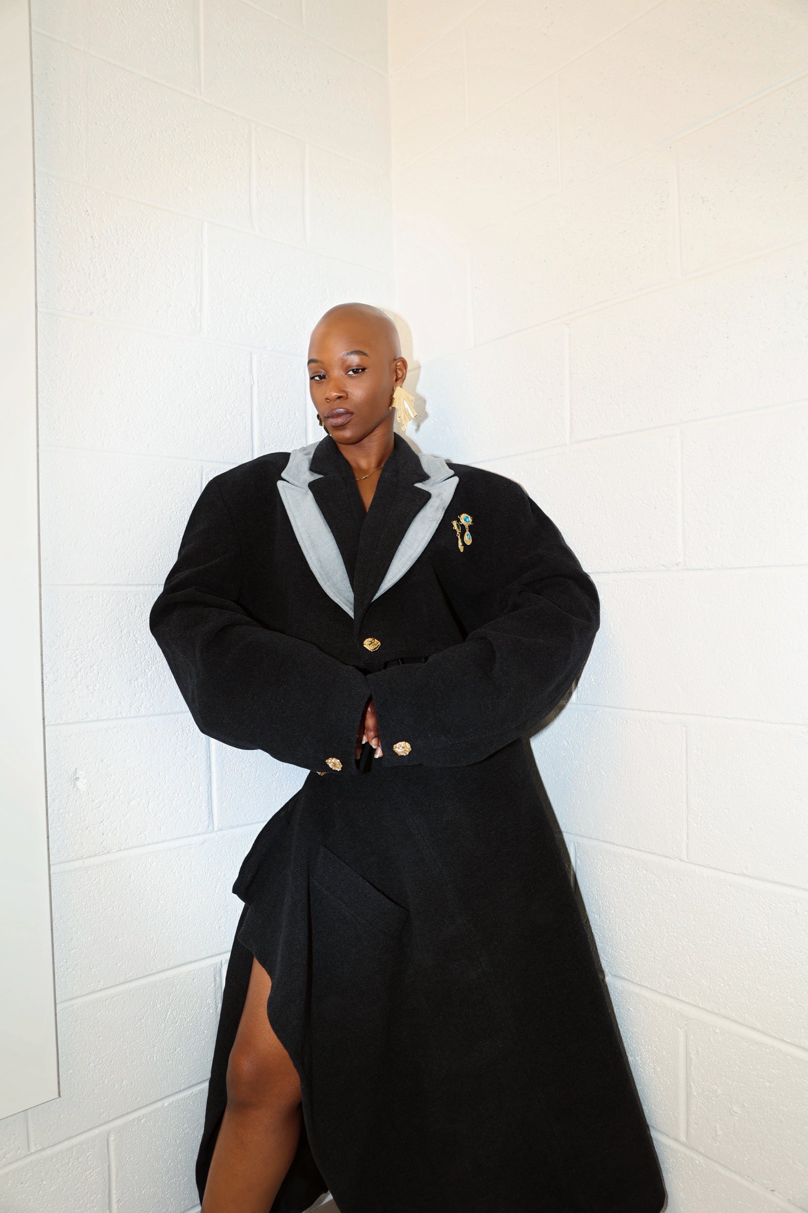 The MANA set is a one-of-a-kind vintage two-piece made from a rich black wool blend, restructured into a bold silhouette. The cropped blazer features a striking double collar design—with a contrast grey inner lapel layered beneath a sharp black outer lapel—bringing extra dimension to a classic shape. Gold-toned statement buttons punctuate the look, while the oversized sleeves add intentional drama.
