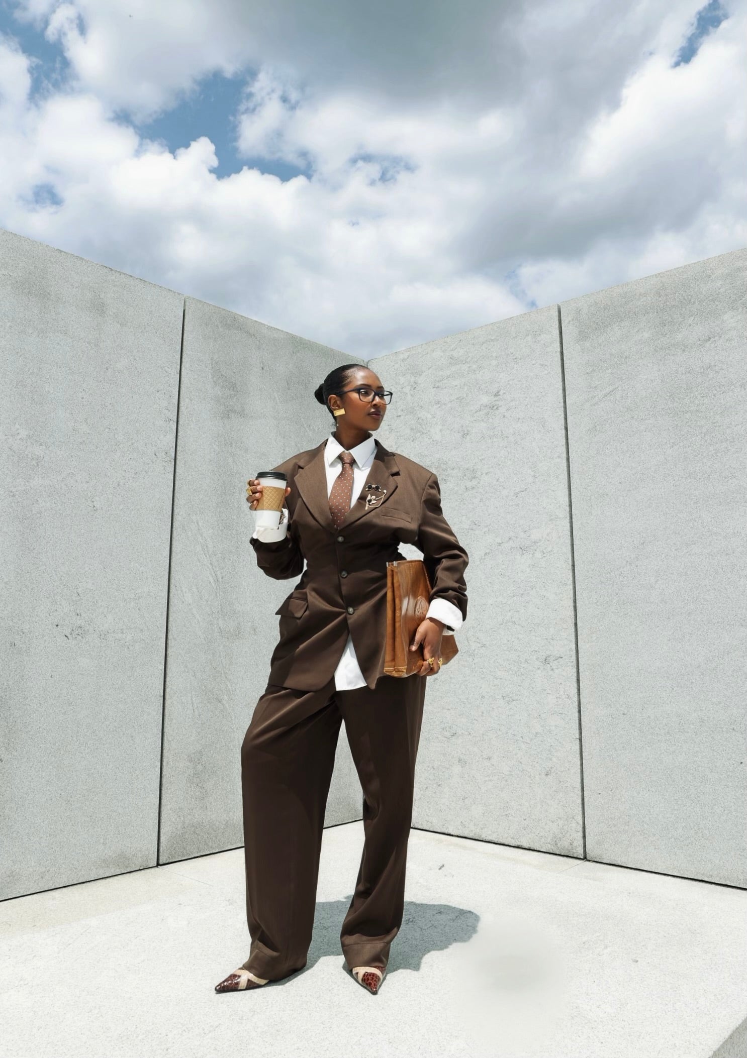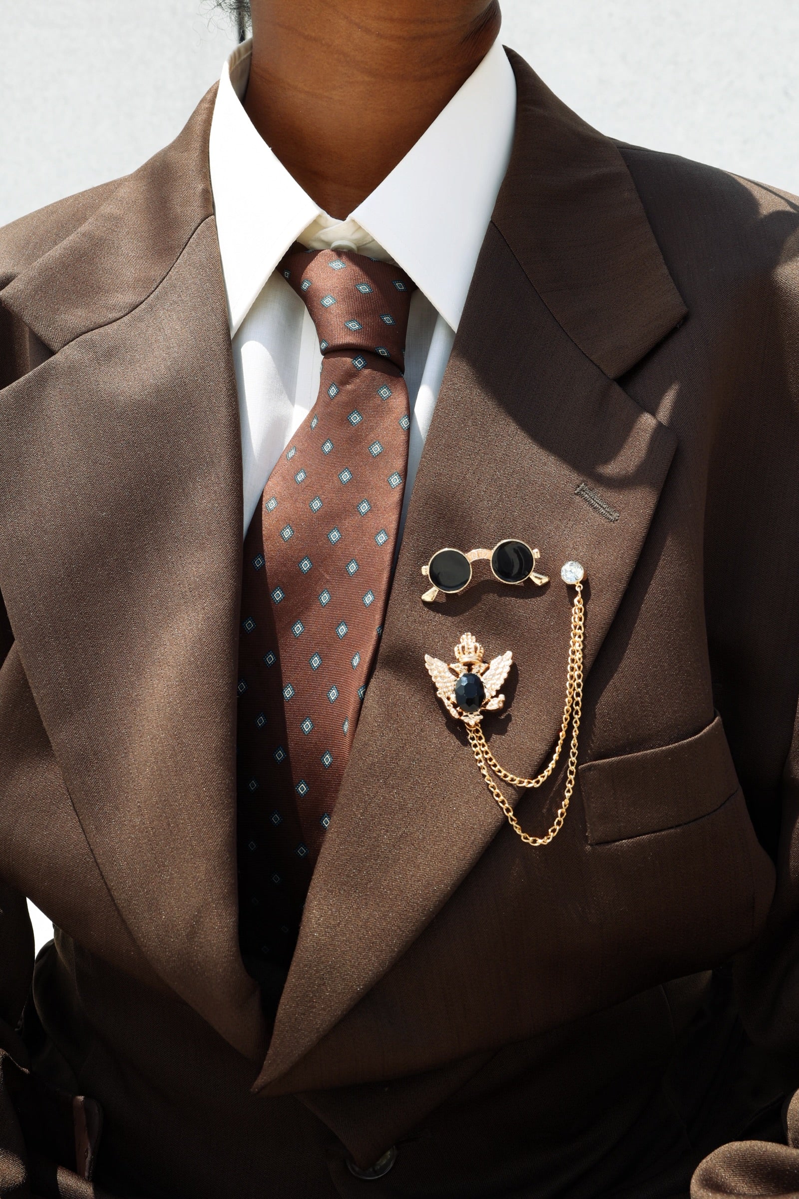 The Milo set is a one-of-one reworked vintage suit sold exactly as styled, including the tailored blazer, wide-leg trousers, patterned tie, and gold-tone brooch. Designed for structure and edge, it features strong shoulders, clean lines, and a deep brown tone that makes a bold statement.