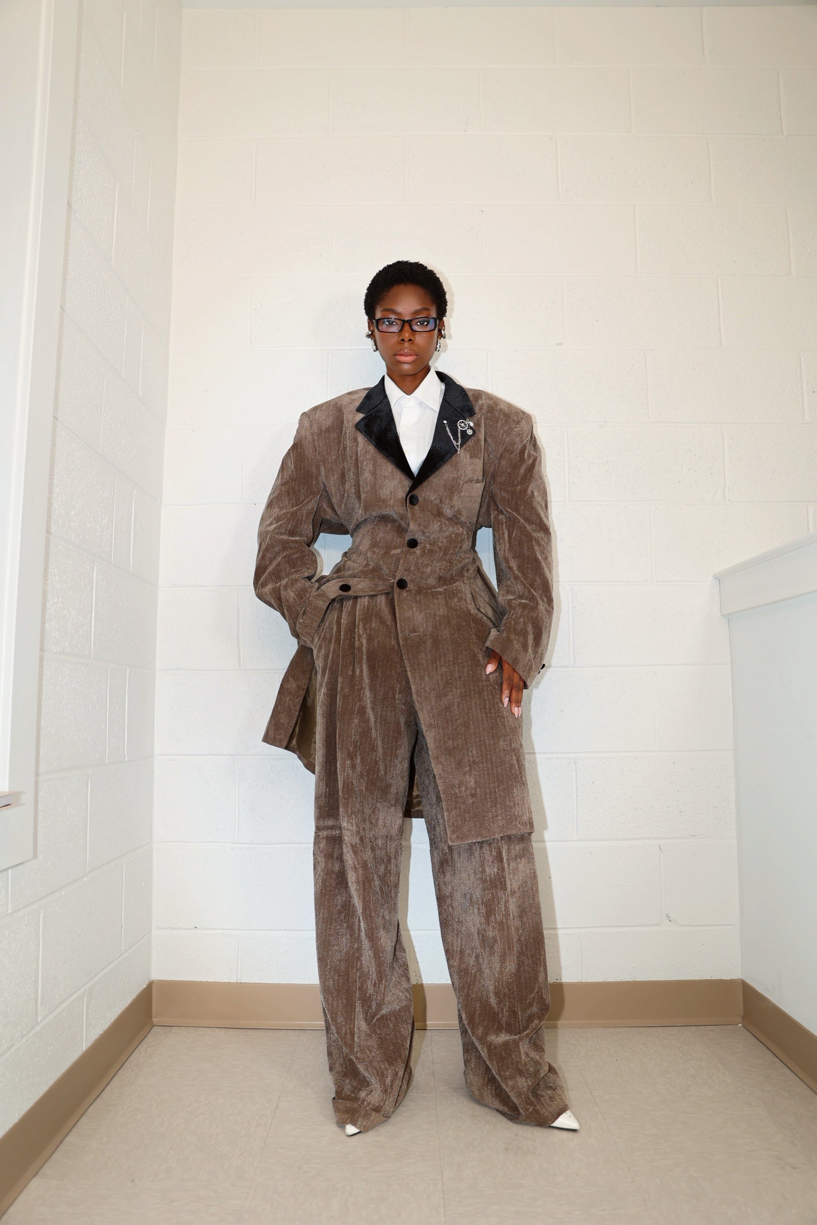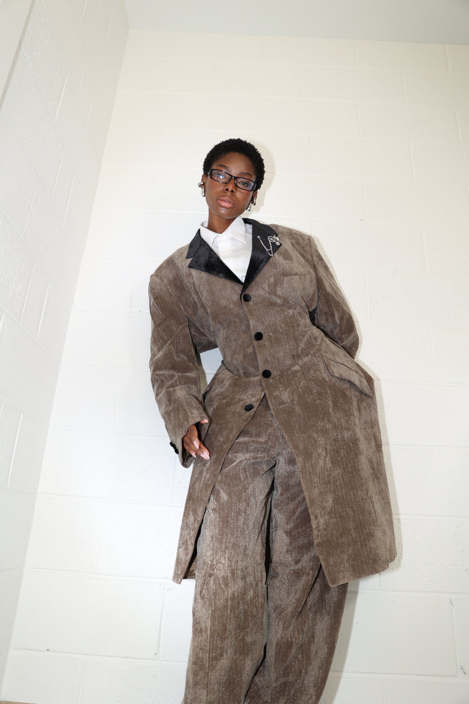 The NIBU set is a vintage reworked two-piece with quiet luxury in its bones. Made from a soft, crushed velvet-like corduroy in a mellow cocoa tone, the jacket features a cinched waist with architectural curves, a sculpted shoulder line, and black contrast lapels that ground the entire look. Velvet black buttons trail down the front, complemented by a silver brooch detail layered with subtle charm.