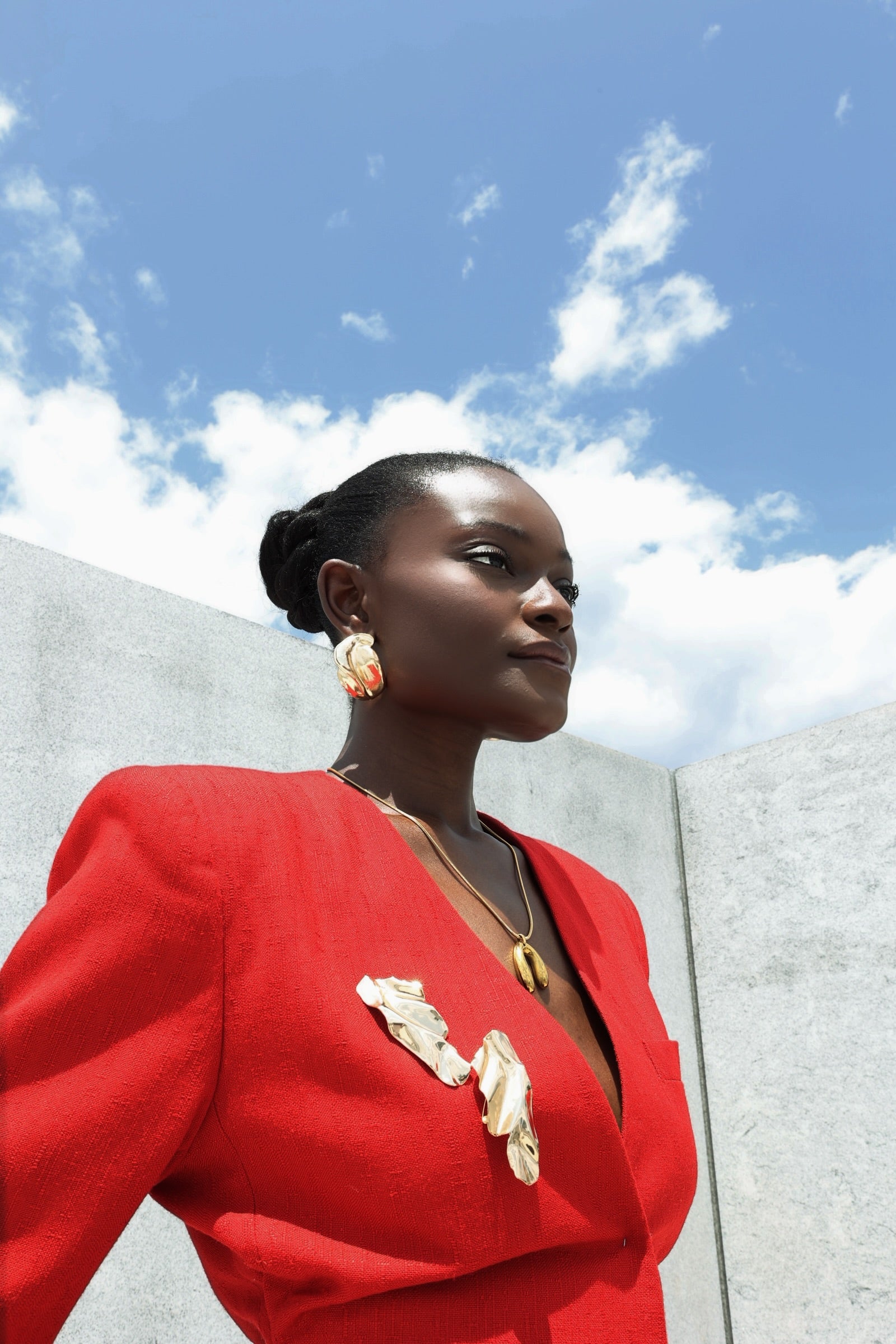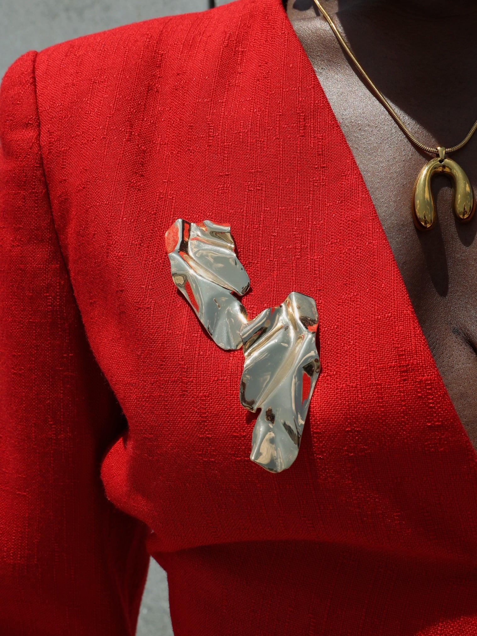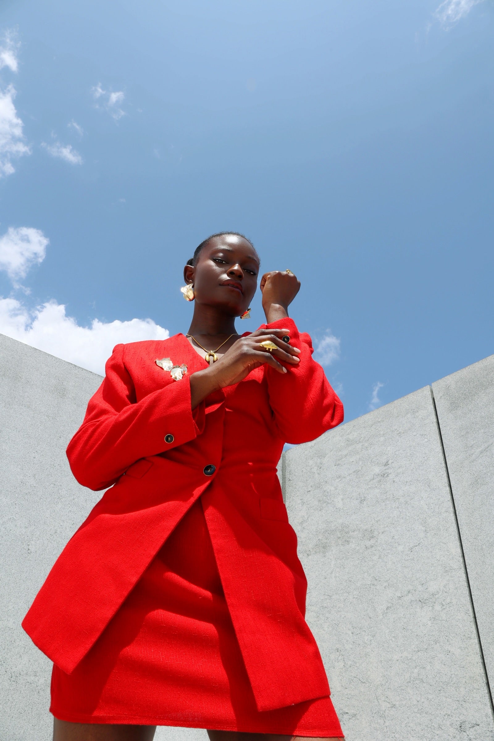 Ruby is a one-of-one reworked vintage mini suit dress, hand-altered for a sculpted, hourglass silhouette. Crafted from a rich textured fabric in bold red, it features exaggerated shoulders, an angular single-button cinch, and a structured skirt cut. A striking abstract gold brooch is included and removable.