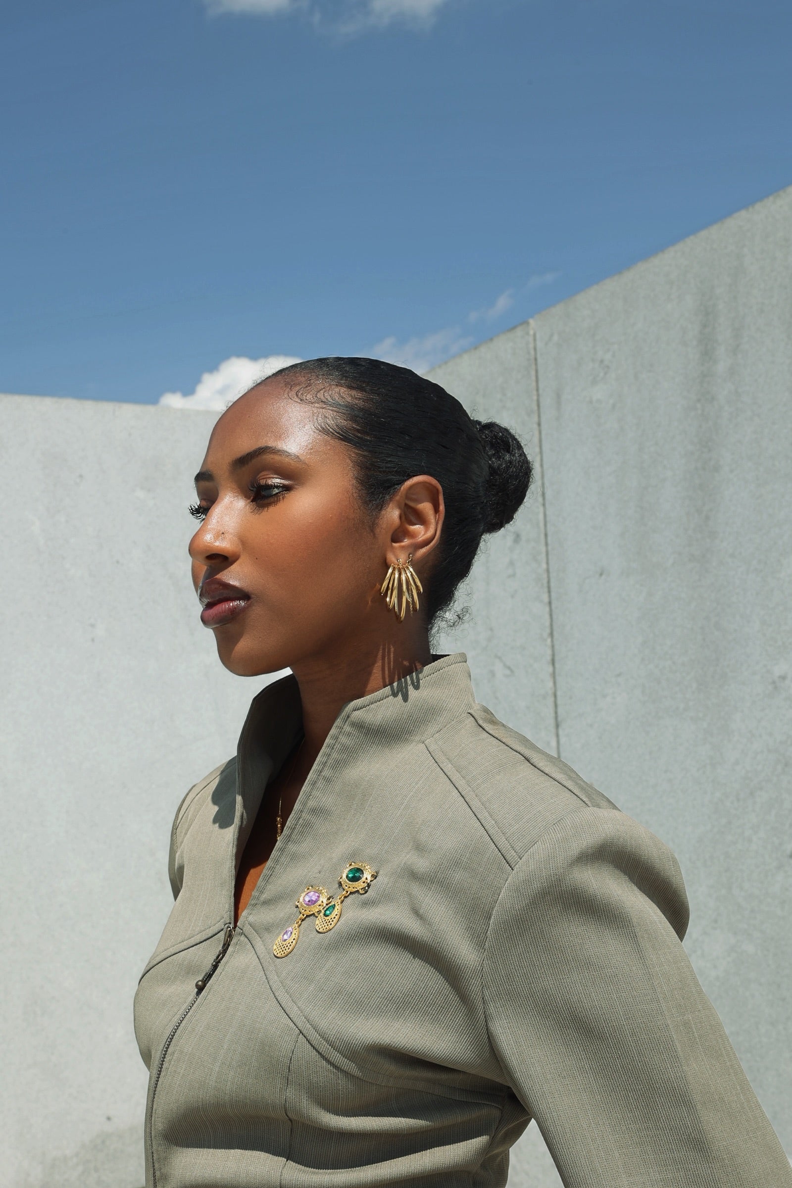 The Scarlett set is a structured khaki green vintage suit mini dress, reworked for a sharp and sculpted silhouette. Tailored with defined shoulders and curved seams, it delivers clean lines and effortless edge. The gemstone-toned gold brooch is included and not removable.
