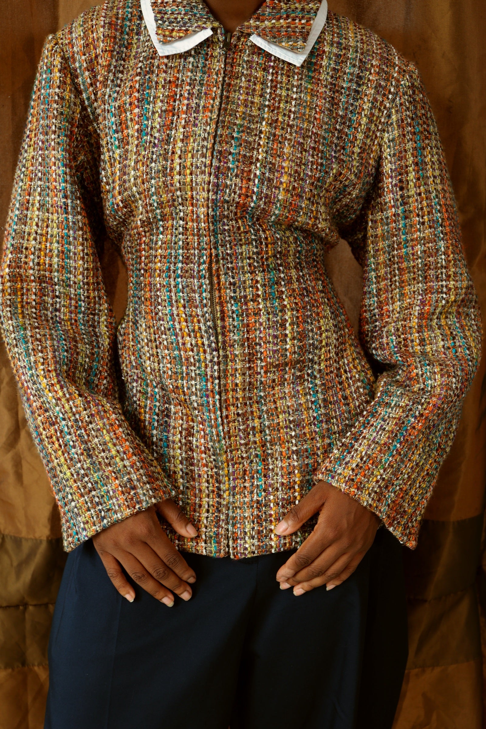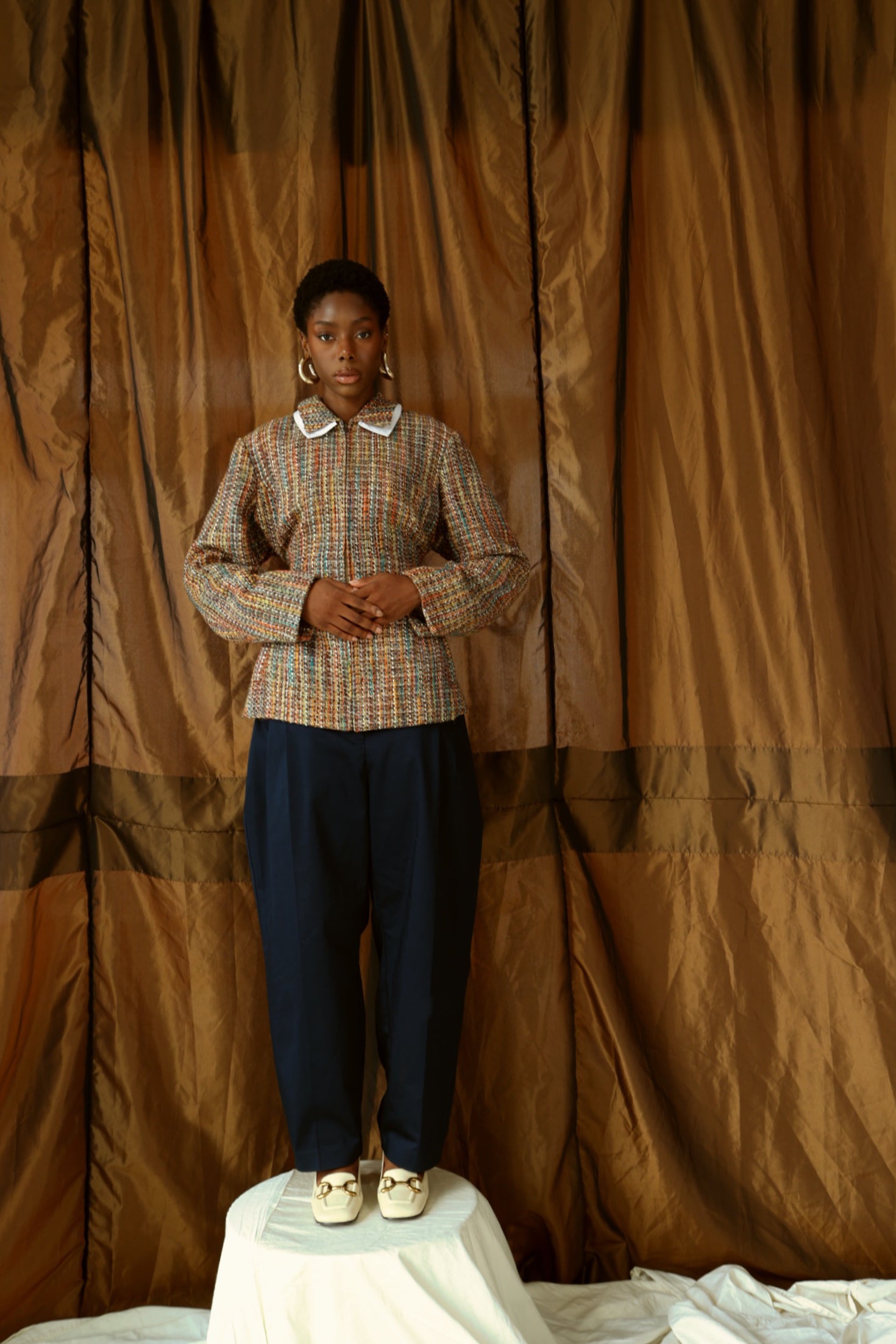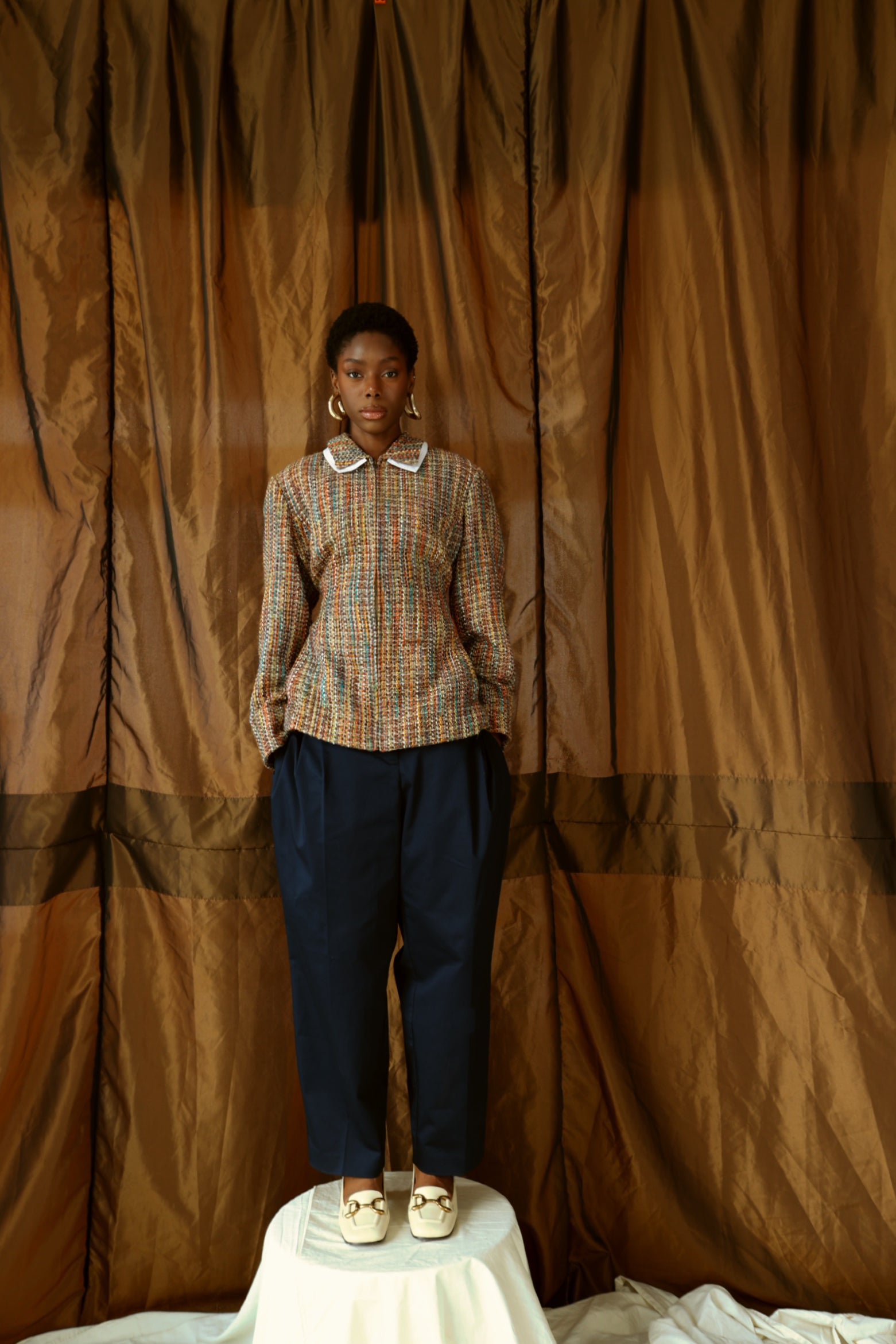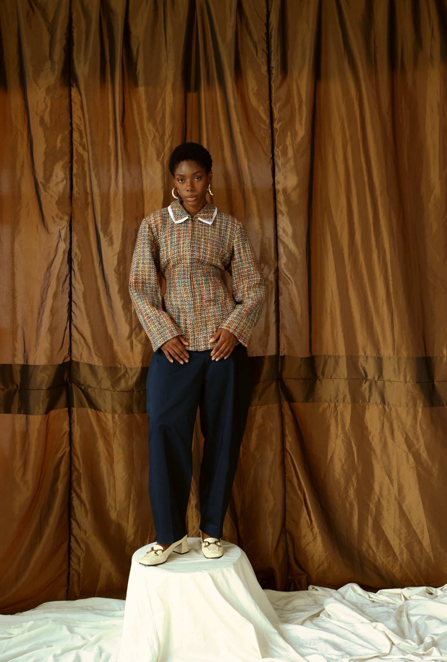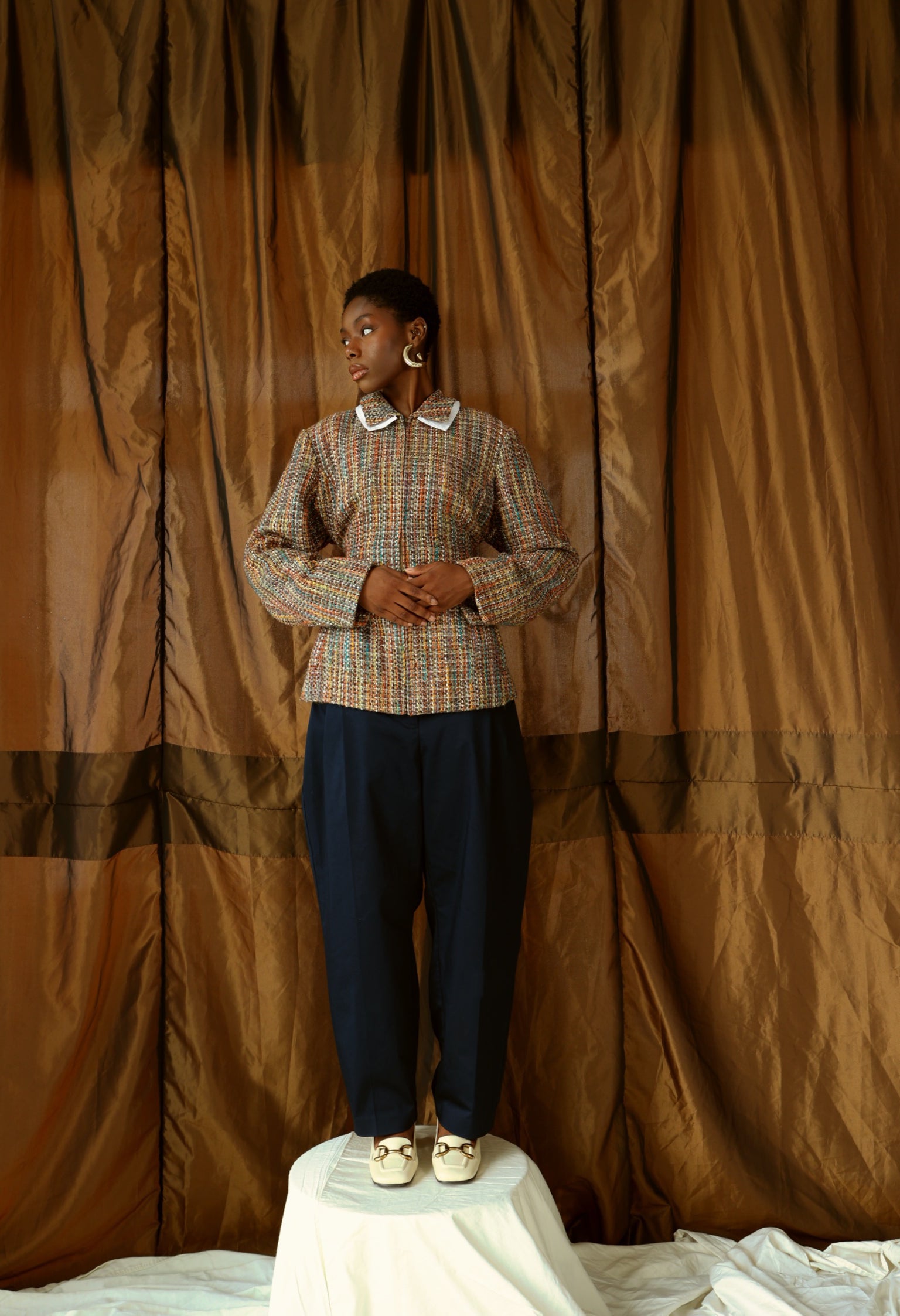 This one-of-a-kind two-piece set features a tailored long-sleeve tweed blouse with a sharp cinched waist and contrast white collar detail. Its rich multicolor weave carries subtle gold shimmer throughout — an understated nod to opulence. Paired with midnight navy trousers, softly pleated and cut to drape with ease, this look balances form and freedom.